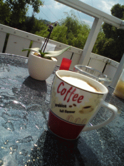 Ich neige dazu, mich mit den Dingen treiben zu lassen, anstatt sie dem Tag zu zuteilen wie ein gut gemischtes Kartenblatt. Deshalb war ich jetzt gerade nochmals in der Küche und habe mir einen guten Kaffee gemacht. Italienischen, nicht allzu kräftig (Caffècrema Dolce). Kaffee geht halt immer. Lustiges Bild: ich treibe auf einer großen Woge Kaffee durch den Tag. Nun ja...